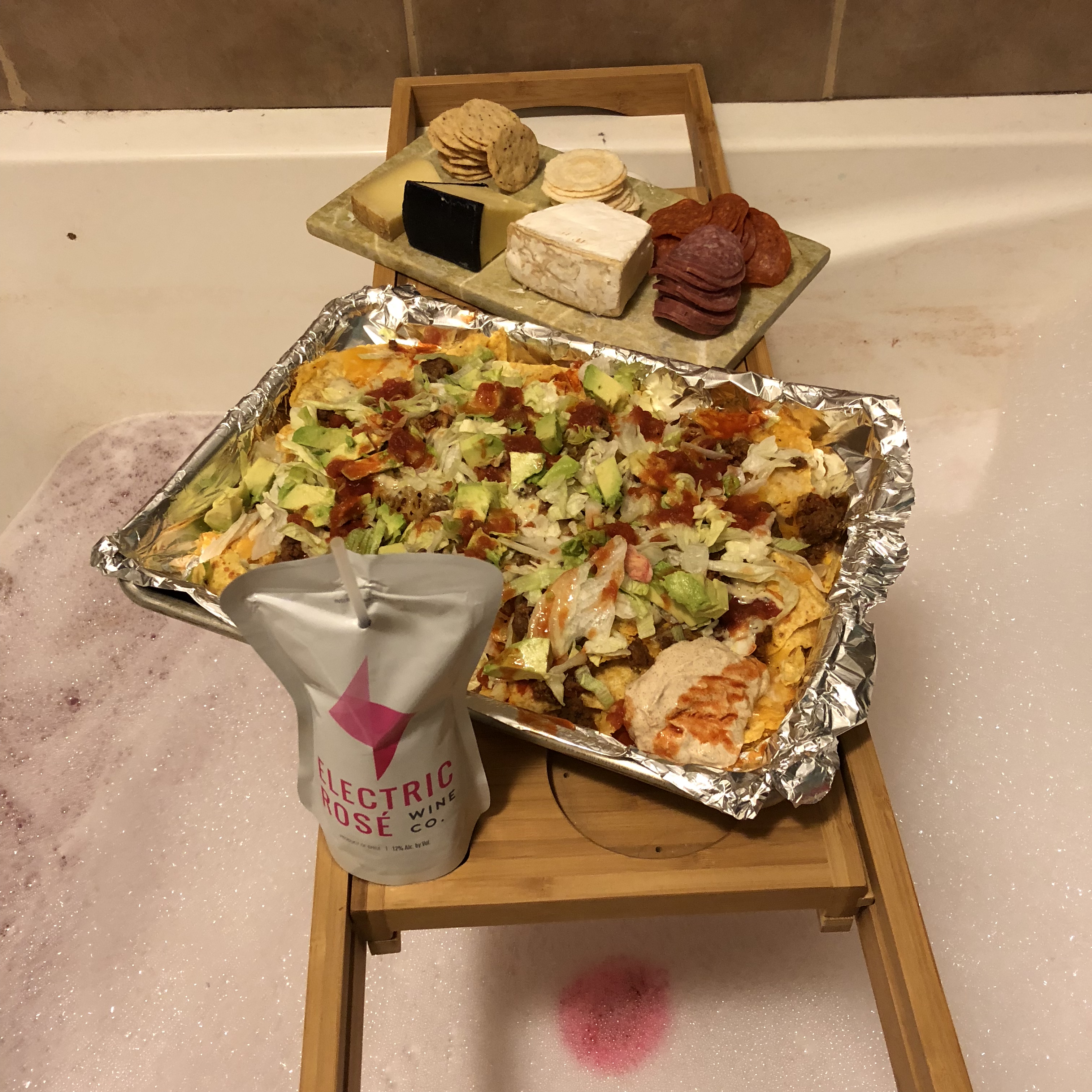 I took a super relaxing bath with cheese, charcuterie, nachos, and wine.