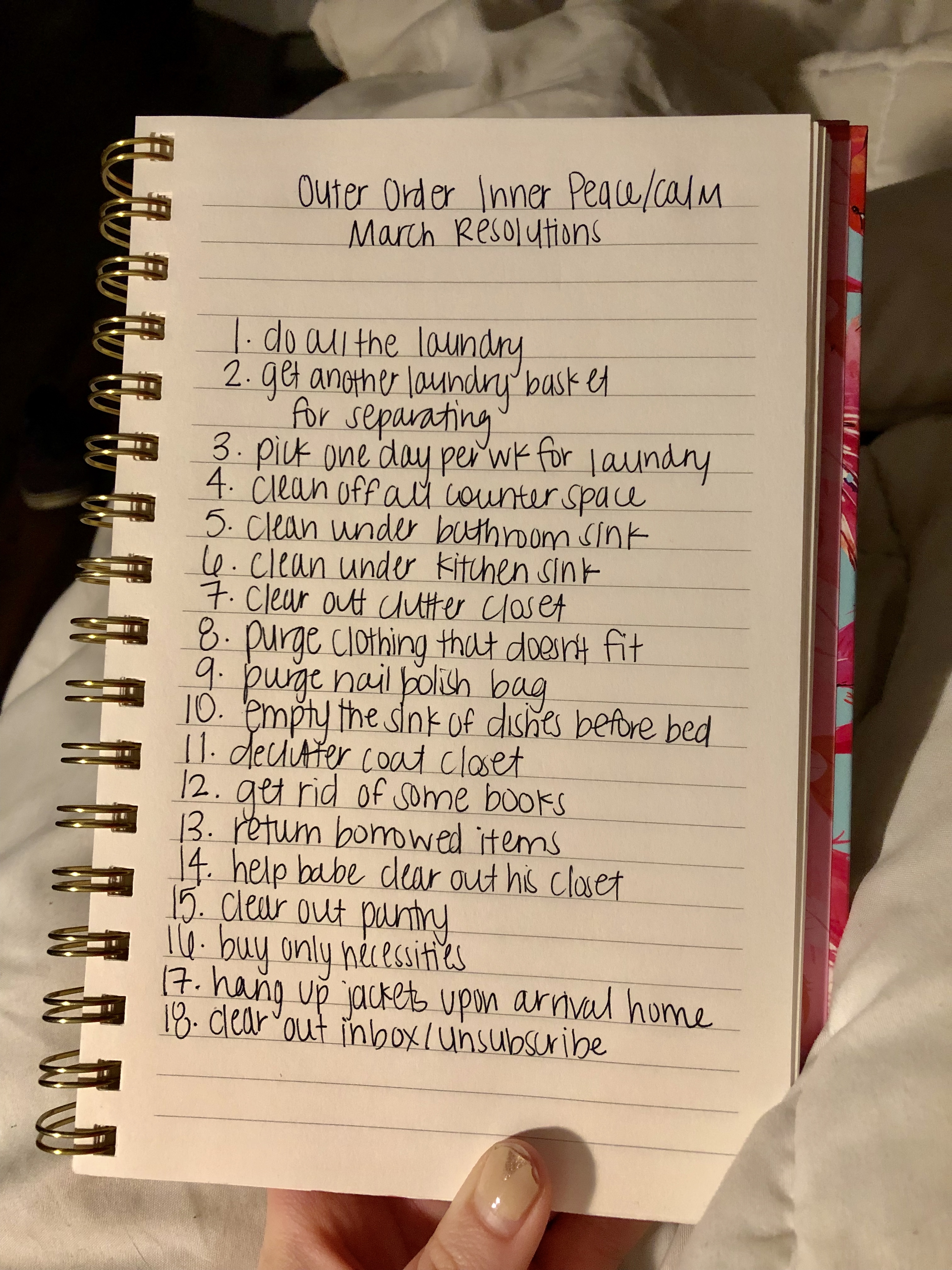 The Happiness Project Experience! I have joined the yearlong program created by Gretchen Rubin and March’s theme is Outer Order, Inner Calm. I made a list of places to clean around the house and resolutions for the month. I deep cleaned the bathroom floor and it was oddly satisfying. With the clutter around the house, I have been trying to be intentional about putting shoes, jackets, books, etc. out of the way and off the counters. For the patio, I got some cushions and a table to decorate it after cleaning it all off.