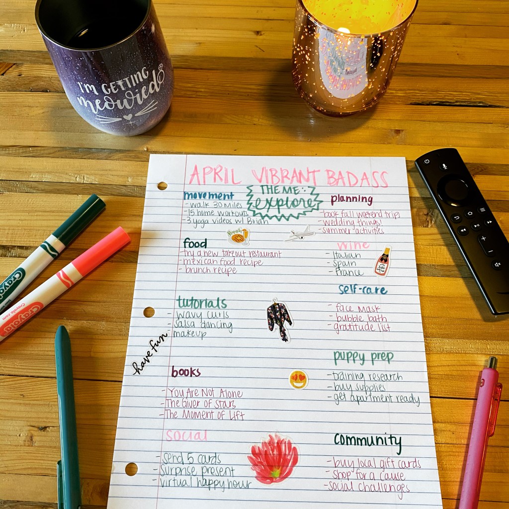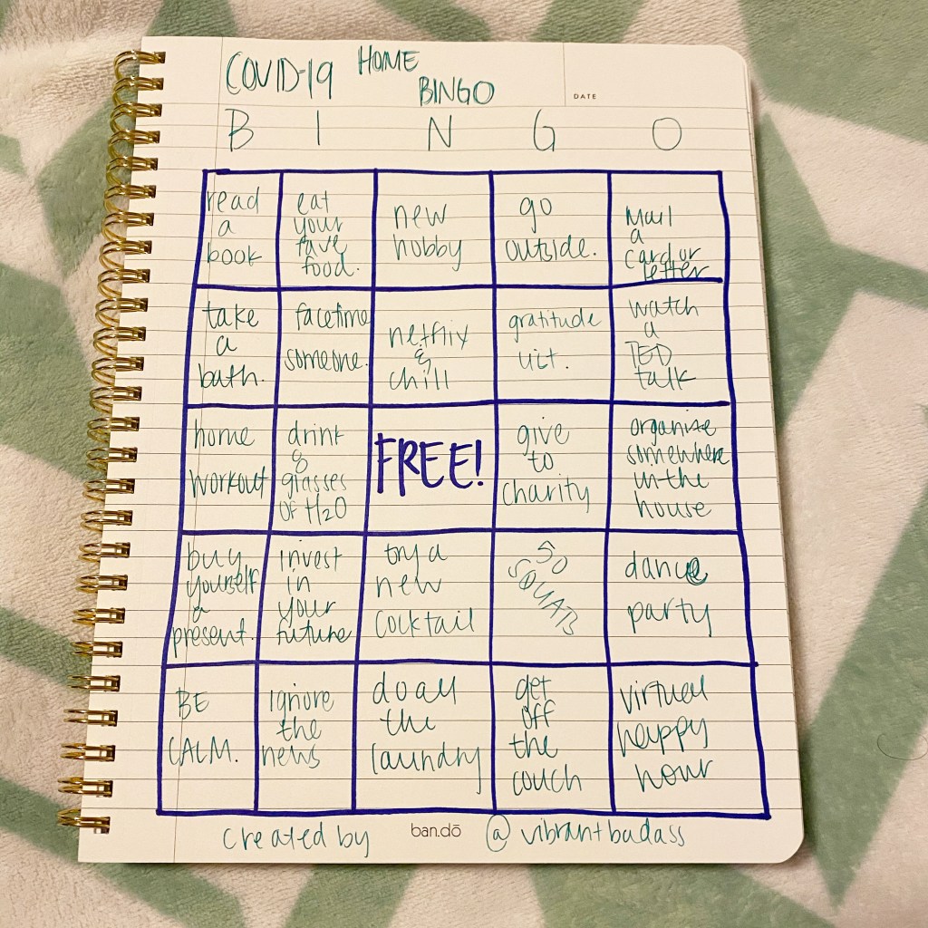 Life in Coronavirus times. I have started to make some specific Vibrant Badass lists related to being Safer At Home and Social Distancing. Who knows how long this will all last. Before being forces to stay at home, I often found myself very busy and over scheduled. One positive of this time is the expansive opportunity for self-care. It is all very unsure but I’m hoping we all come out with more compassion for others, gratitude for the things we do have and better routines for taking care of ourselves.