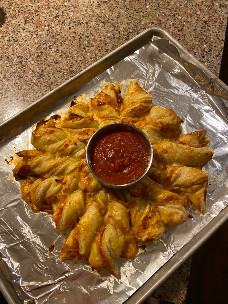 Be sure to bake until golden brown. I took it out early a couple of times and the dough was a bit gooey. The end result was absolutely delicious. We used marinara as the dipping sauce.