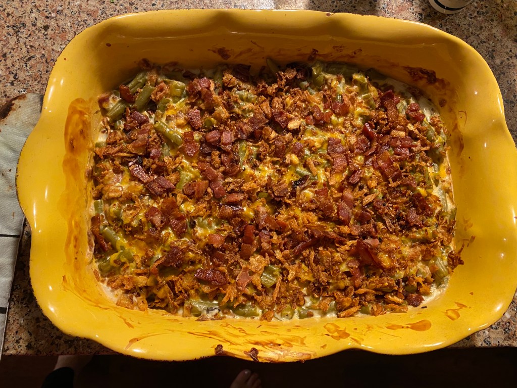 I made green bean casserole to go with pork tenderloin. It is not a complicated recipe at all and is very delicious. For instructions, I turned to the OG company – Campbell’s. Their website has the recipe for classic green bean casserole as well as Bacon & Cheddar Green Bean casserole which is the one that I attempted!