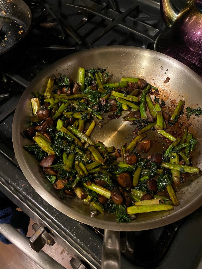 Fresh Thai asparagus, kale and garlicky mushrooms. This skillet vegetable dish was very tasty. I did cook the kale a bit too long. It was the last thing to throw in. I should have cooked the rest longer and then pulled the dish quicker after adding the kale. It was really good though!