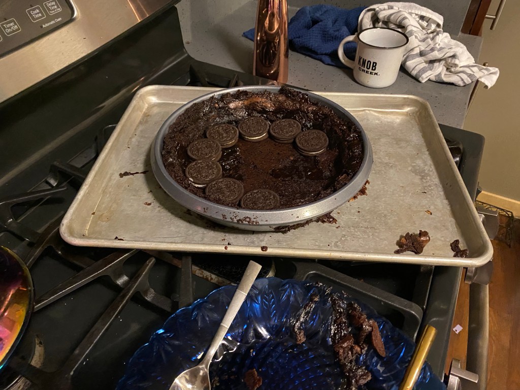 We made this for our cat Neptune’s 5th birthday. This is another amazing recipe from Buzzfeed Tasty. I definitely recommend this recipe but it does take a while to make. We didn’t have all of the exact right pans for this so it was a bit tricky. There was a little smoke out incident where the brownie batter overflowed and spilled into the bottom of the oven. We then placed a large cookie sheet under it to catch the rest of the spillage.