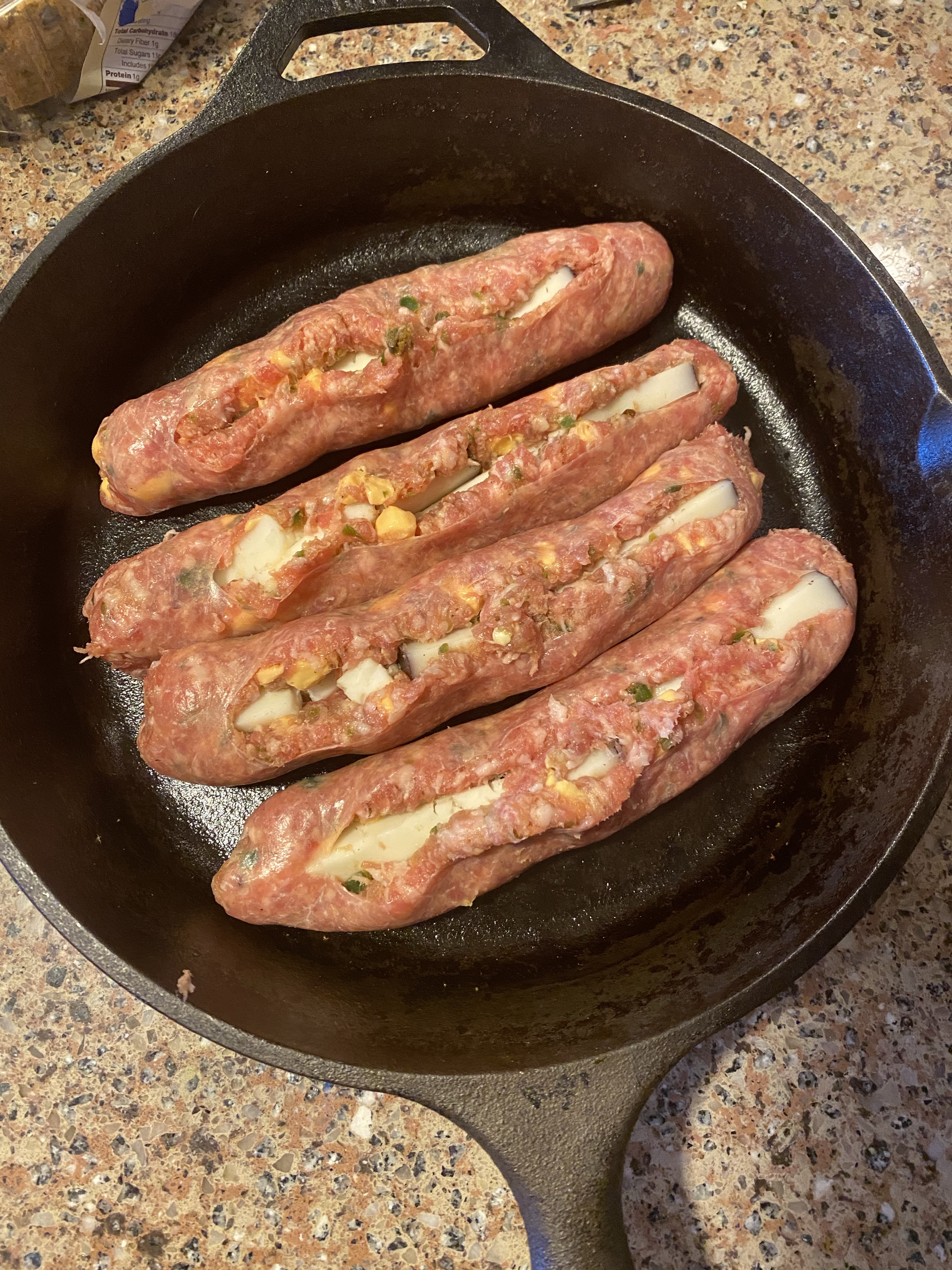 We started with some jalapeño cheddar sausages and drunken goat cheese from our local grocery store Metcalfe’s. We split open the sausages and put the drunken goat inside. We put the sausages in cast iron skillet and covered them with marinara sauce then added Italian seasoning and garlic powder. Next up, we put butter and garlic on the inside of hoagie buns and covered them in aluminum foil. We baked the whole cast iron dish and the buns at 400 for about 25-30 minutes.