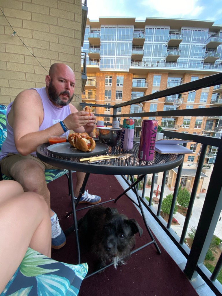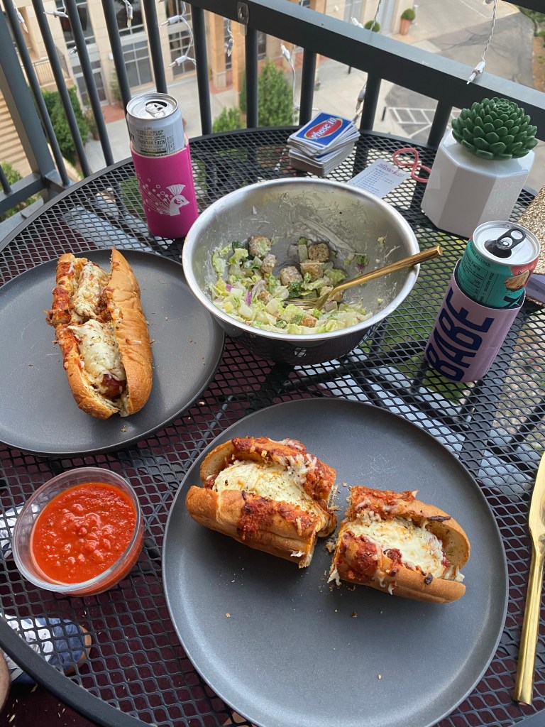 Then we ate the masterpieces on the patio. We paired the sausage pizza subs with some caesar salad. Cheers to patio season and all the summer dishes we are going to make.